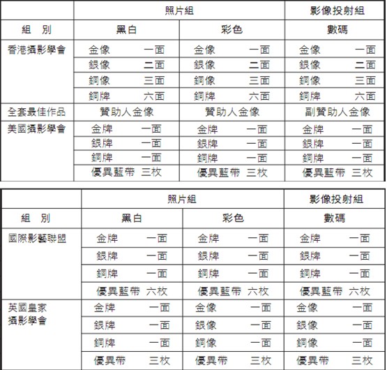 黑白(彩色)照片组各设有PSA奖牌(最佳照片)、FIAP金牌、FIAP银牌、沙龙银章、FIAP优异丝带4条,优秀奖;